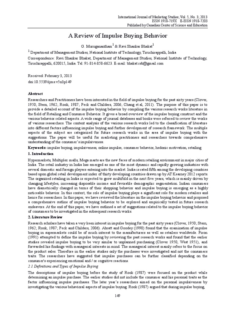 However, literature review on impulse buying behavior, the presently available neurological evidence does not fully explain how concrete neural literature review on impulse buying behavior and cognitive processes can cause normal-shopping behavior to become addictive in the absence of exogenous drug stimulation Clark, ; Engel and Caceda, Unlike in other addictive conditions, it has been stated that the development of CBB depends on the presence of particular cultural mechanisms, such as a market-based economy, a wide variety of available goods, disposable income, and materialistic values Unger et al.